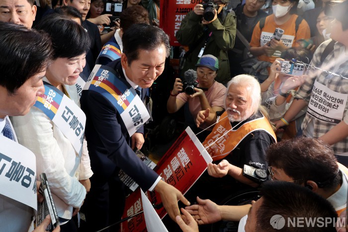 [서울=뉴스핌] 정일구 기자 = 정청래 더불어민주당 대표와 김병기 원내대표를 비롯한 의원들이 2일 오전 서울 용산구 용산역에서 전국장애인차별철폐연대(전장연) 관계자들과 인사하고 있다. 2025.10.02 mironj19@newspim.com