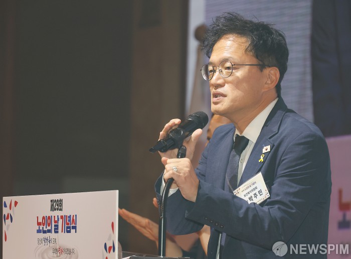 [서울=뉴스핌] 류기찬 기자 = 박주민 국회 보건복지위원장이 2일 서울 중구 소공로 롯데호텔 크리스탈볼룸에서 열린 ‘제29회 노인의 날 기념식’에서 축사를 하고 있다. 2025.10.02 ryuchan0925@newspim.com