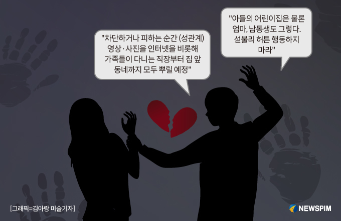"차단하거나 피하는 순간 영상·사진을 인터넷을 비롯해 가족들이 다니는 직장부터 집 앞 동네까지 모두 뿌릴 예정이다. 아들의 어린이집은 물론 엄마, 남동생도 그렇다. 섣불리 허튼 행동하지 마라."