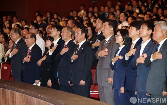 [서울=뉴스핌] 정일구 기자 = 김민석 국무총리와 김병기 더불어민주당 원내대표 비롯한 내빈들이 3일 오전 서울 종로구 세종문화회관에서 열린 제4357주년 개천절 경축식에서 국민의례를 하고 있다. 2025.10.03 mironj19@newspim.com
