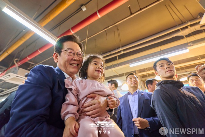 [서울=뉴스핌] 이재명 대통령이 3일 인천 강화제일풍물시장을 찾아 어린아이와 기념촬영을 하고 있다. [사진=대통령실] 2025.10.03 photo@newspim.com