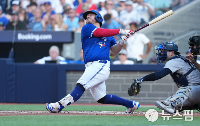 [토론토 로이터=뉴스핌] 장환수 스포츠전문기자= 토론토 포수 알레한드로 커크가 5일 뉴욕 양키스와 ALDS 홈 1차전에서 2회 솔로 홈런을 날리고 있다. 2025.10.05 zangpabo@newspim.com |