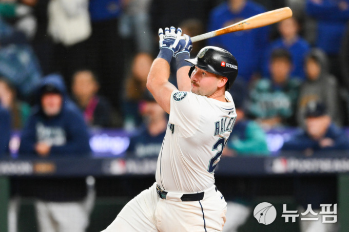 [시애틀 로이터=뉴스핌] 장환수 스포츠전문기자= 시애틀 포수 칼 롤리가 5일 디트로이트와 ALDS 홈 1차전에서 8회 안타를 날리고 있다. 2025.10.05 zangpabo@newspim.com |