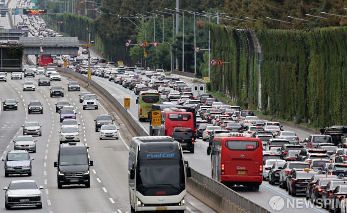 [서울=뉴스핌] 김학선 기자 = 추석을 하루 앞둔 5일 오후 서울 서초구 잠원IC 인근 경부고속도로 하행선이 막바지 귀성 차량들로 정체를 빚고 있다. 2025.10.05 yooksa@newspim.com