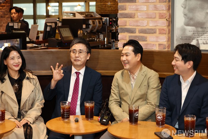 [서울=뉴스핌] 최지환 기자 = '건국전쟁 1·2'를 제작한 김덕영 감독이 7일 오후 서울 영등포구 롯데시네마 영등포점 인근 카페에서 장동혁 국민의힘 대표와 간담회를 가지고 있다. 2025.10.07 choipix16@newspim.com