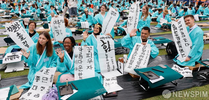 [서울=뉴스핌] 류기찬 기자 = 제579회 한글날인 9일 오전 서울 종로구 광화문광장에서 열린 ‘한글창제 579주년 기념 광화문광장 휘호대회’에서 외국인 참가자들이 휘호를 선보이고 있다. 2025.10.09 ryuchan0925@newspim.com