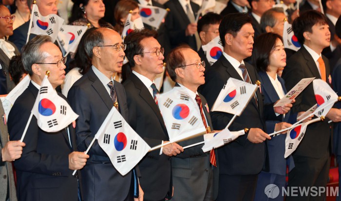 [서울=뉴스핌] 류기찬 기자 = 김민석 국무총리를 비롯한 참석자들이 9일 오전 서울 종로구 세종문화회관에서 열린 579돌 한글날 경축식에서 한글날 노래를 부르고 있다. 2025.10.09 ryuchan0925@newspim.com