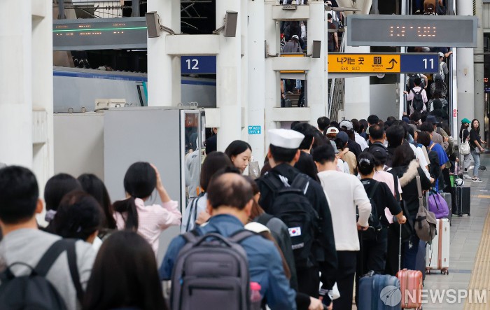 [서울=뉴스핌] 류기찬 기자 = 추석연휴 마지막 날이자 한글날인 9일 오후 서울역에서 귀경객들이 기차에서 내려 이동하고 있다. 2025.10.09 ryuchan0925@newspim.com