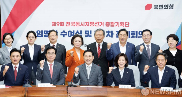 [서울=뉴스핌] 윤창빈 기자 = 장동혁 국민의힘 대표, 송언석 원내대표, 나경원 위원장 등 참석자들이 10일 오전 서울 여의도 국회에서 열린 지방선거총괄기획단 임명장 수여식 및 제1차 전체회의에서 기념촬영을 하고 있다. 2025.10.10 pangbin@newspim.com