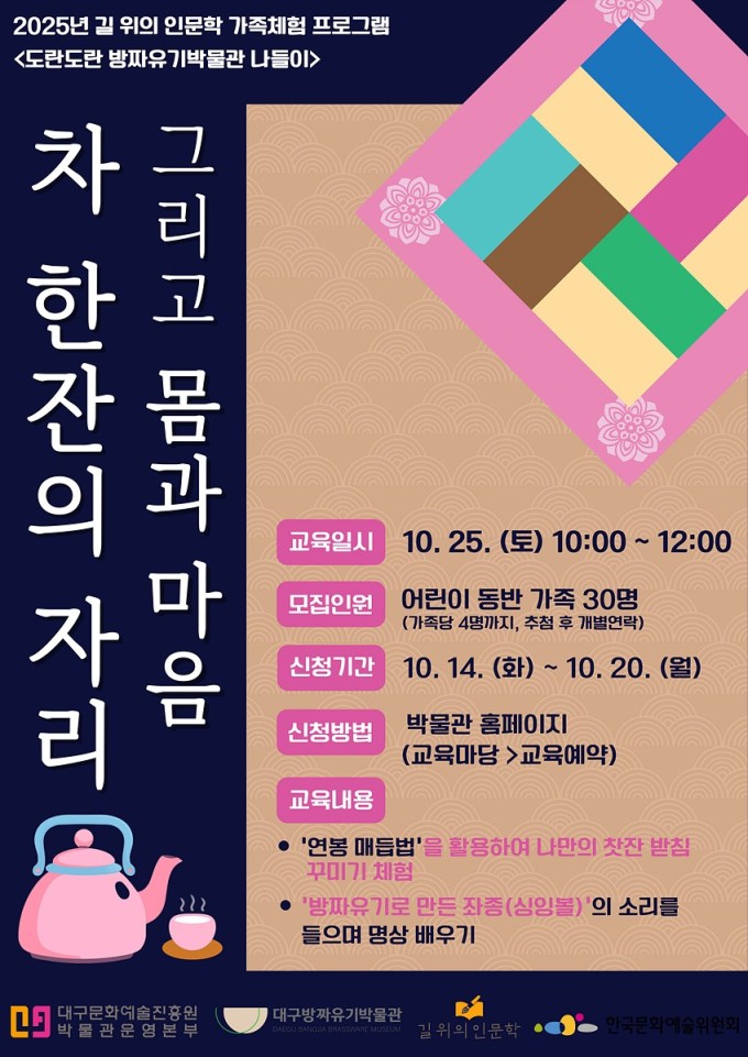 오는 25일 10시에는 어린이 동반 가족들을 대상으로 전통공예 문화를 체험할 수 있는 '도란도란 방짜유기박물관 나들이'를 운영한다. 10월 주제는 '차 한잔의 자리, 그리고 몸과 마음'이며, 풍성한 가을을 맞아 특별한 내용으로 구성했다. 체험은 다도와 다양한 종류의 명상을 통해 팔공산의 가을 운치를 느끼고, 일상에서 쉽게 경험하기 힘든 '찻잔받침 만들기'를 통해 특별한 경험을 제공할 것으로 기대한다.