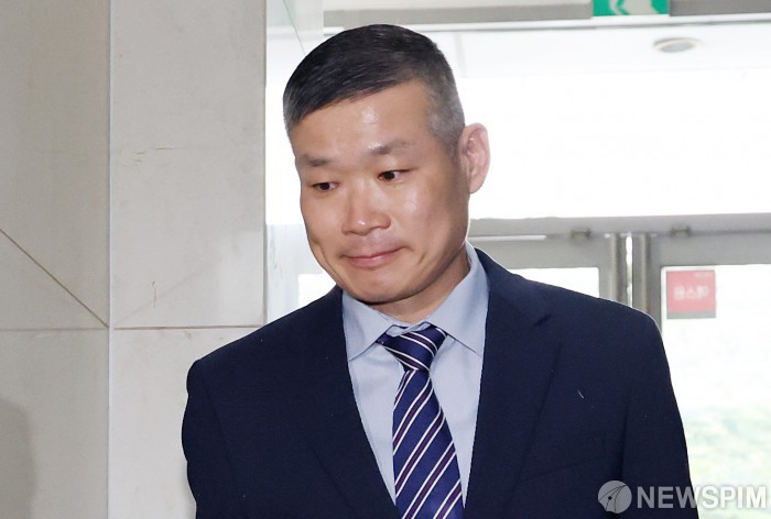 [서울=뉴스핌] 정일구 기자 = 김동혁 전 국방부 검찰단장이 10일 오후 서울 서초구 서초한샘빌딩에 마련된 순직해병 특검 사무실로 소환 조사를 받기 위해 피의자 신분으로 출석하고 있다. 2025.10.10 mironj19@newspim.com