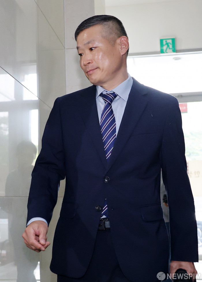 [서울=뉴스핌] 정일구 기자 = 김동혁 전 국방부 검찰단장이 10일 오후 서울 서초구 서초한샘빌딩에 마련된 순직해병 특검 사무실로 소환 조사를 받기 위해 피의자 신분으로 출석하고 있다. 2025.10.10 mironj19@newspim.com