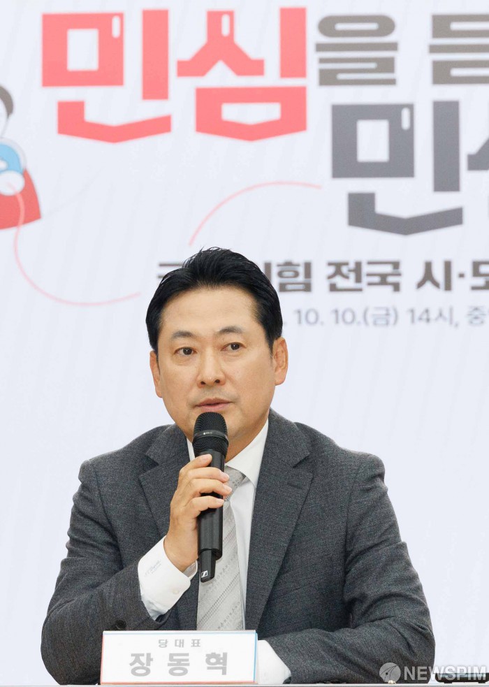 [서울=뉴스핌] 윤창빈 기자 = 장동혁 국민의힘 대표가 10일 오후 서울 여의도 국민의힘 중앙당사에서 열린 전국 시도당위원장 간담회에서 모두발언을 하고 있다. 2025.10.10 pangbin@newspim.com