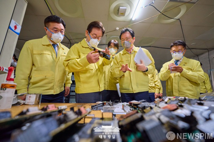 [서울=뉴스핌] 이재명 대통령이 10일 대전 유성구 국가정보자원관리원 화재 현장을 찾아 복구 상황을 점검하고 있다. [사진=대통령실] 2025.10.10 photo@newspim.com