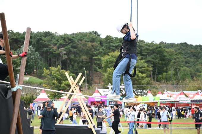 축제장을 찾은 한 방문객이 바우덕이 줄타기를 체험하고 있다[사진=안성시] |