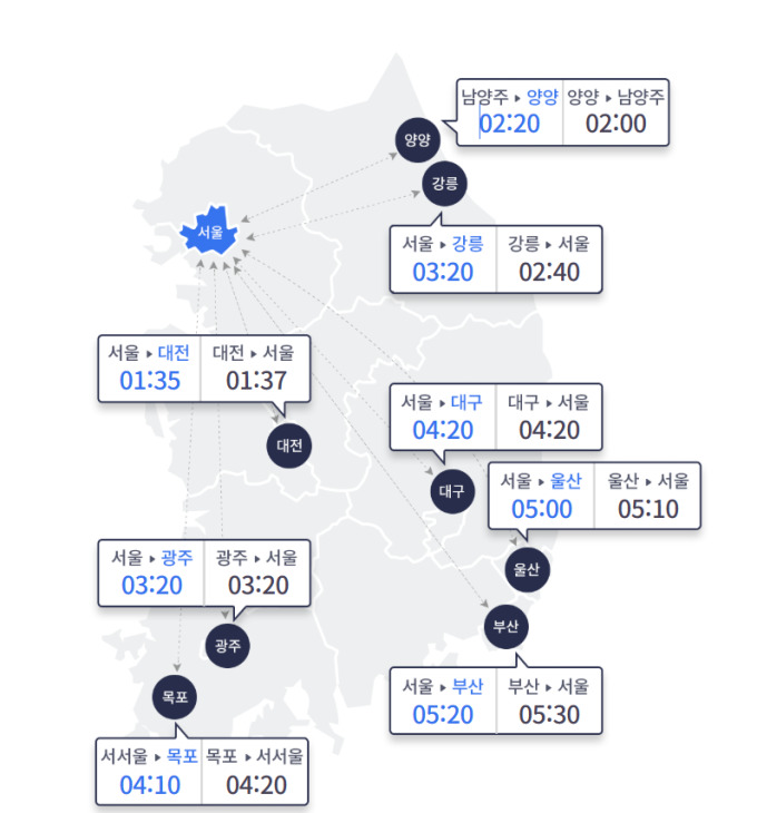 주요 노선별 서울 방향(상행) 최대 소요 시간(요금소 기준)은 ▲대전→서울 2시간 ▲부산→서울 5시간 30분 ▲광주→서울 3시간 50분 ▲목포→서서울 4시간 20분 ▲강릉→서울 3시간 20분 ▲양양→남양주 2시간 30분 수준으로 예상된다.