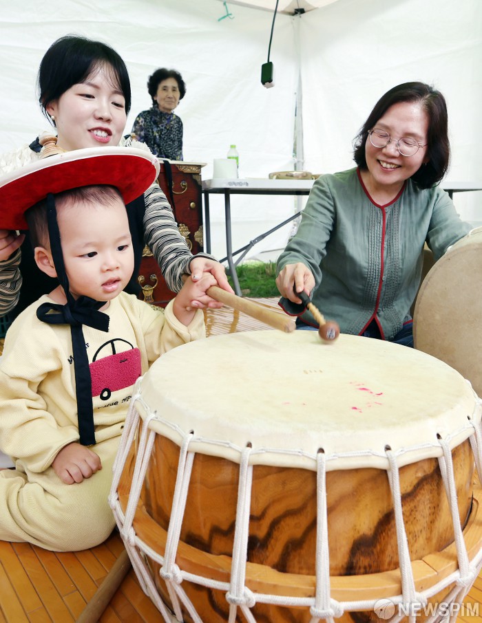 [서울=뉴스핌] 양윤모 기자 = 연휴 마지막날인 12일 오후 평창읍 평창강 일원에서 열린 '2025 평창 백일홍축제'를 찾은 어린이가 전통악기 체험을 하고 있다. [사진=평창군청] 2025.10.12 yym58@newspim.com