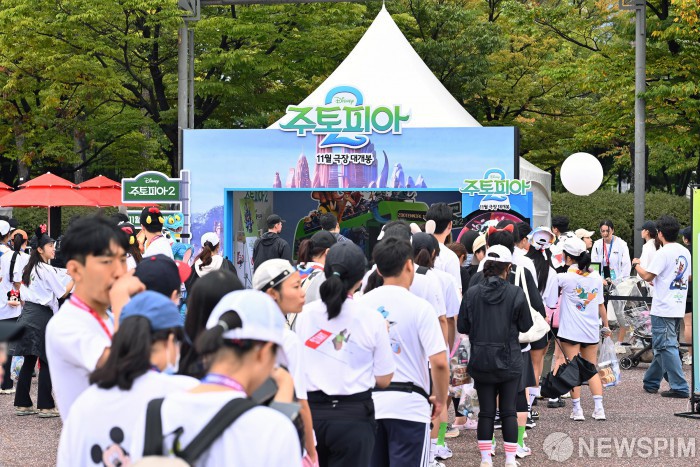 [서울=뉴스핌] 지난 11일 서울 여의도공원에서 열린 ‘디즈니런 서울 2025’ 행사장에 마련된 <주토피아2> 부스 앞이 체험을 기다리는 참가자들로 붐비고 있다. 부스에서는 캐릭터를 활용한 러너 맞춤형 경품 증정 이벤트와 더불어, 새롭게 등장하는 캐릭터 ‘게리’, 그리고 주인공 ‘닉’과 ‘주디’의 스태츄 포토존이 최초로 공개되며 참가자들의 눈길을 집중시켰다. [사진=디즈니코리아] 2025.10.12 photo@newspim.com