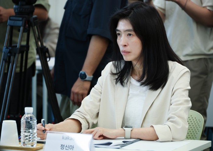 사진은 지난 9월 11일 서울 강남구 네이버스퀘어 역삼에서 열린 금감원장-빅테크 CEO 간담회 현장. 정신아 카카오 대표가 이찬진 금융감독원장의 모두발언을 듣고 있다. [사진=뉴스핌DB] |