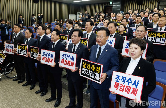 [서울=뉴스핌] 윤창빈 기자 = 장동혁 국민의힘 대표, 송언석 원내대표 등 소속 의원들이 13일 오전 서울 여의도 국회에서 열린 긴급 의원총회에서 피켓을 들고 구호를 외치고 있다. 2025.10.13 pangbin@newspim.com