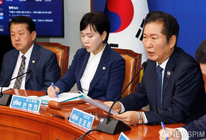 [서울=뉴스핌] 윤창빈 기자 = 정청래 더불어민주당 대표가 13일 오전 서울 여의도 국회에서 열린 최고위원회의에서 모두발언을 하고 있다. 2025.10.13 pangbin@newspim.com