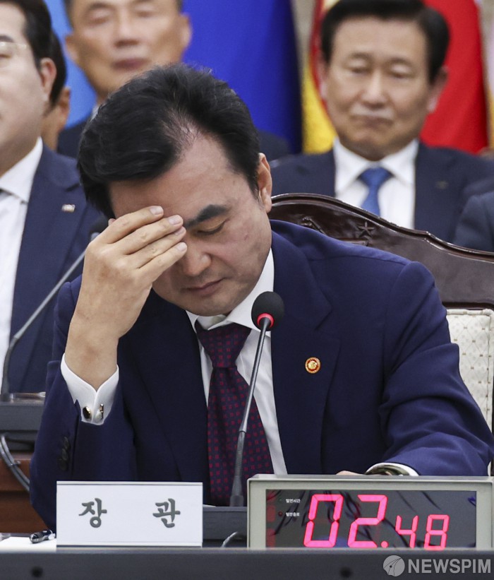 [서울=뉴스핌] 국회사진기자단 = 안규백 국방부 장관이 13일 오전 서울 용산구 국방부 청사에서 열린 2025 국방부 국정감사에서 머리를 매만지고 있다. 2025.10.13 photo@newspim.com |