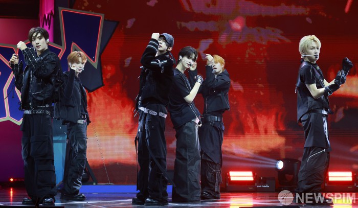 [서울=뉴스핌] 김학선 기자 = 그룹 투어스(TWS/신유, 도훈, 영재, 한진, 지훈, 경민)가 13일 서울 광진구 예스24라이브홀에서 열린 미니 4집 ‘play hard’ 쇼케이스에서 선공개곡 'Head Shoulders Knees Toes' 무대를 선보이고 있다. 2025.10.13 yooksa@newspim.com