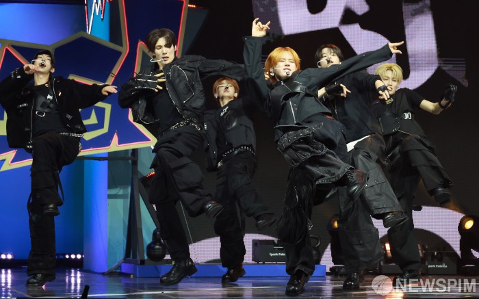 [서울=뉴스핌] 김학선 기자 = 그룹 투어스(TWS/신유, 도훈, 영재, 한진, 지훈, 경민)가 13일 서울 광진구 예스24라이브홀에서 열린 미니 4집 ‘play hard’ 쇼케이스에서 선공개곡 'Head Shoulders Knees Toes' 무대를 선보이고 있다. 2025.10.13 yooksa@newspim.com