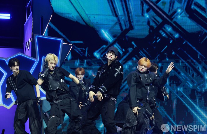 [서울=뉴스핌] 김학선 기자 = 그룹 투어스(TWS/신유, 도훈, 영재, 한진, 지훈, 경민)가 13일 서울 광진구 예스24라이브홀에서 열린 미니 4집 ‘play hard’ 쇼케이스에서 선공개곡 'Head Shoulders Knees Toes' 무대를 선보이고 있다. 2025.10.13 yooksa@newspim.com