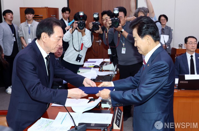 [서울=뉴스핌] 최지환 기자 = 정동영 통일부 장관이 14일 오전 서울 여의도 국회 외교통일위원회에서 열린 통일부 등에 대한 국정감사에서 김석기 외교통일위원장에게 증인선서문을 제출하고 있다. 2025.10.14 choipix16@newspim.com