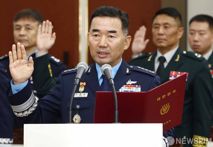 [서울=뉴스핌] 국회사진기자단 = 진영승 합동참모본부 의장이 14일 오전 서울 용산구 합동참모본부에서 열린 2025년 국정감사에서 증인 선서를 하고 있다. 2025.10.14 photo@newspim.com