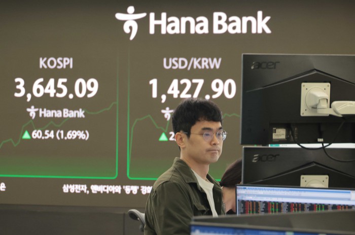 [서울=뉴스핌] 이길동 기자 = 삼성전자 호실적·美기술주 훈풍에 코스피가 3600 재돌파한 가운데 14일 오전 서울 중구 하나은행 딜링룸에 코스피-코스닥 지수 및 달러/원 환율이 표시되어 있다. 2025.10.14 gdlee@newspim.com |