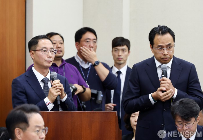 [서울=뉴스핌] 최지환 기자 = 김범석 우아한형제들 대표가 14일 오후 서울 여의도 국회 정무위원회에서 열린 공정거래위원회, 개인정보보호위원회 등 국정감사에서 의원 질의에 답변하고 있다. 왼쪽은 김명규 쿠팡이츠 대표. 2025.10.14 choipix16@newspim.com |