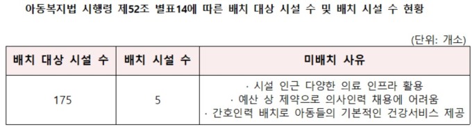아동복지법 시행령에 따라 정부와 보건소 등과 협의 끝에 계약의사 배치가 가능하다는 답변을 받아도 아동복지 현상에서는 배치가 어렵다. 아동복지시설 계약의사 배치 대상 시설 175곳 중 계약의사가 배치된 시설은 단 5곳이다. 이마저도 모두 제주도에 설치된 아동양육시설로 다른 지역은 전무하다.