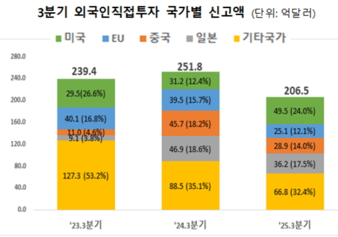 우선 3분기 누적 투자신고액은 206.5억 달러로 전년동기 대비 18% 감소했다.