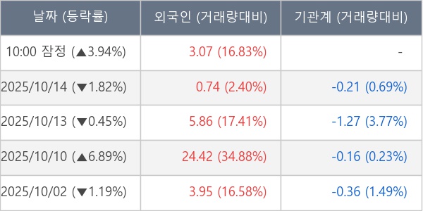 [서울=뉴스핌] 로보뉴스 = 15일 10시 15분 현재 지투파워(388050)는 전일 대비 3.94% (현재가 8,980원) 상승했고, 외국인이 최근 5일 연속 순매수(누적 38.04만 주, 잠정) 행진을 하고 있다.