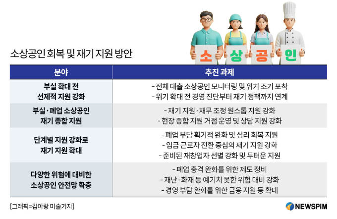 [세종=뉴스핌] 김기랑 기자 = 정부가 소상공인의 위기 대응 체계를 '사후 지원'에서 '선제 대응'으로 전환하는 종합 대책을 내놨다. 매출·신용 정보를 분석해 부실 징후를 조기 포착하고, 위기 단계별로 필요한 금융·상담·심리 회복 등을 맞춤 지원하는 내용이 골자다. 정부는 폐업에 이르기 전에 먼저 개입하고, 이후 재도전까지 끌어주는 '전주기 회복 지원 시스템'을 구축하겠다는 구상이다.