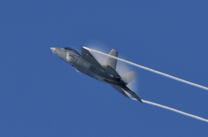 17일부터 19일까지 서울아덱스 퍼블릭데이 기간 중 KF-21 전투기는 매일 한 차례 시범비행을 한다. 사진은 15일 서울공항에서 관람객들 머리 위에서 초음속 기동을 펼쳐보이는 KF-21 전투기. [사진=디펜스타임스 제공] 2025.10.15 gomsi@newspim.com |