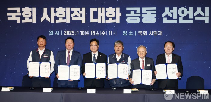 [서울=뉴스핌] 정일구 기자 = 우원식 국회의장과 노사 5단체 대표들이 15일 서울 여의도 국회 사랑재에서 열린 국회 사회적 대화 공동 선언식에서 선언문에 서명한 뒤 기념촬영을 하고 있다. 왼쪽부터 양경수 민주노총 위원장, 최태원 대한상의 회장, 우 의장, 김동명 한국노총 위원장, 손경식 경총 회장, 김기문 중기중앙회장. 2025.10.15 mironj19@newspim.com