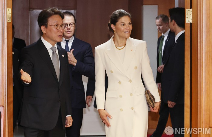 [서울=뉴스핌] 청사사진기자단= 김민석 총리와 빅토리아 잉그리드 알리스 데시리에 스웨덴 왕세녀가 15일 서울 종로구 정부서울청사에서 열리는 면담으로 들어서고 있다. 스웨덴 국왕 칼 구스타프 16세의 장녀 빅토리아 왕세녀는 현재 스웨덴 왕위 계승 서열 1위다. 빅토리아 왕세녀가 스웨덴 왕위 계승권자로 공식 방한한 것은 지난 2015년 방한한 이후 10년 만이다. 2025.10.15 photo@newspim.comm.com