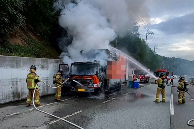 [포항=뉴스핌] 남효선 기자 = 15일 오후 1시 37분쯤 경북 포항시 연일읍 학전리 28번 국도에서 주행하던 5t 트럭에 화재가 발생해 발화 40여 분 만에 진화됐다. 다행히 인명 피해는 없었다.