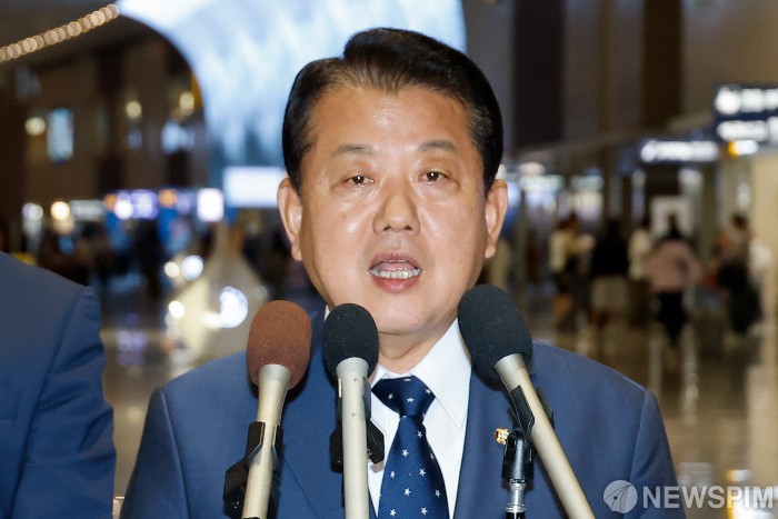 [영종도=뉴스핌] 류기찬 기자 = 김병주 더불어민주당 의원이 한국인 납치, 구금 사태에 대응하기 위해 15일 오후 인천국제공항 제2여객터미널에서 캄보디아로 출국하기 전 입장을 밝히고 있다. 2025.10.15 ryuchan0925@newspim.com