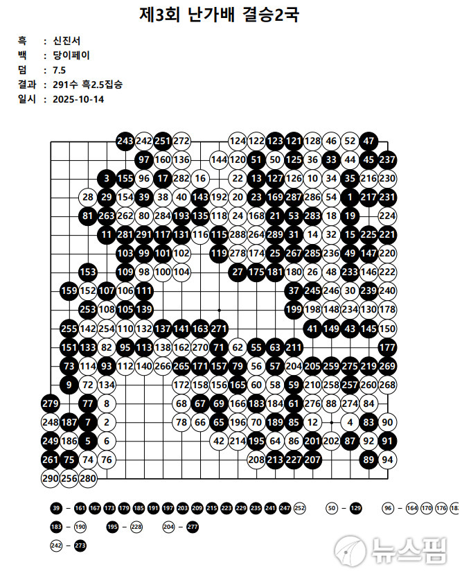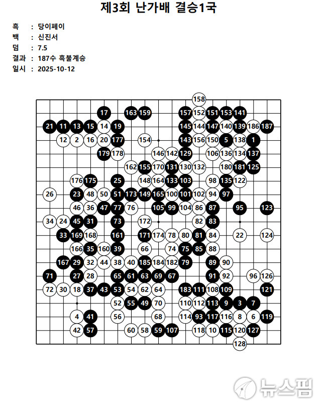 초중반까지 팽팽했던 승부였으나 중앙 전투에서 당이페이 9단이 신진서 9단의 강공을 타개하며 형세가 조금씩 기울었다. 신진서 9단도 끝까지 추격하며 미세한 승부로 진입했지만, 다시 실수를 범하며 역전에 실패했다.