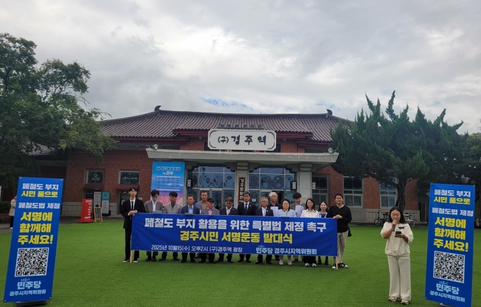 더불어민주당 경주시 지역위원회는 15일 옛 경주역 앞에서 '폐철도법 제정 촉구 시민 서명 운동 발대식'을 열고, 경주시민이 직접 참여하는 입법 촉구 운동 개시를 공식 선언했다고 빍혔다.