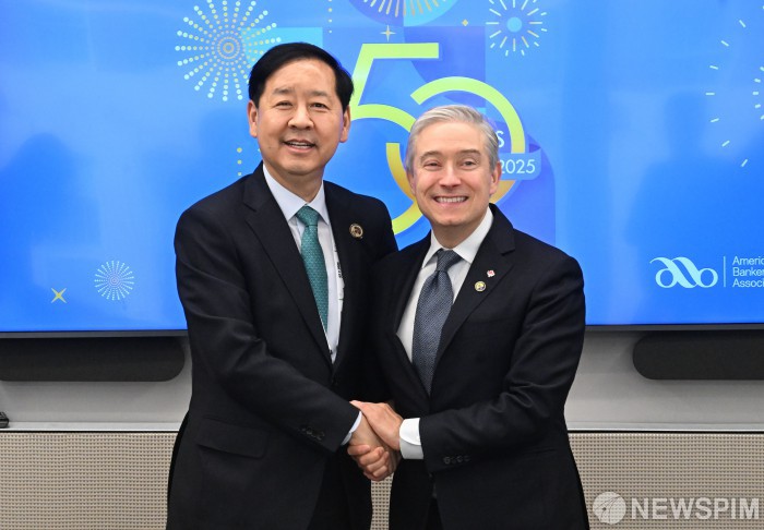 [서울=뉴스핌] 주요20개국(G20) 재무장관회의와 국제통화기금 및 세계은행(IMF/WB) 연차총회 참석차 미국 워싱턴D.C.를 방문중인 구윤철 부총리 겸 기획재정부 장관이 15일(현지시간) 미국은행협회(American Bankers Association)에서 프랑수아 필립 샹파뉴 캐나다 재무장관과 면담에 앞서 악수하며 기념사진을 찍고 있다. [사진=기획재정부] 2025.10.16 photo@newspim.com