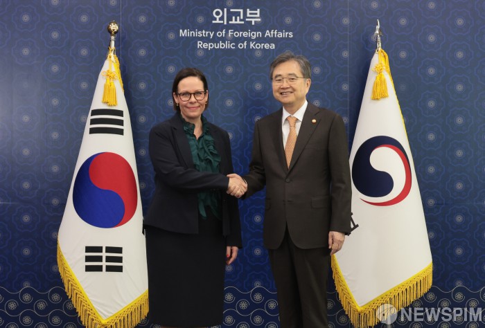 [서울=뉴스핌] 이길동 기자 = 조현 외교장관이 16일 서울 종로구 외교부 청사에서 말메르 스테네르가드(Malmer Stenergard) 스웨덴 외교부 장관과 면담에 앞서 악수하며 기념촬영을 하고 있다. 2025.10.16 gdlee@newspim.com