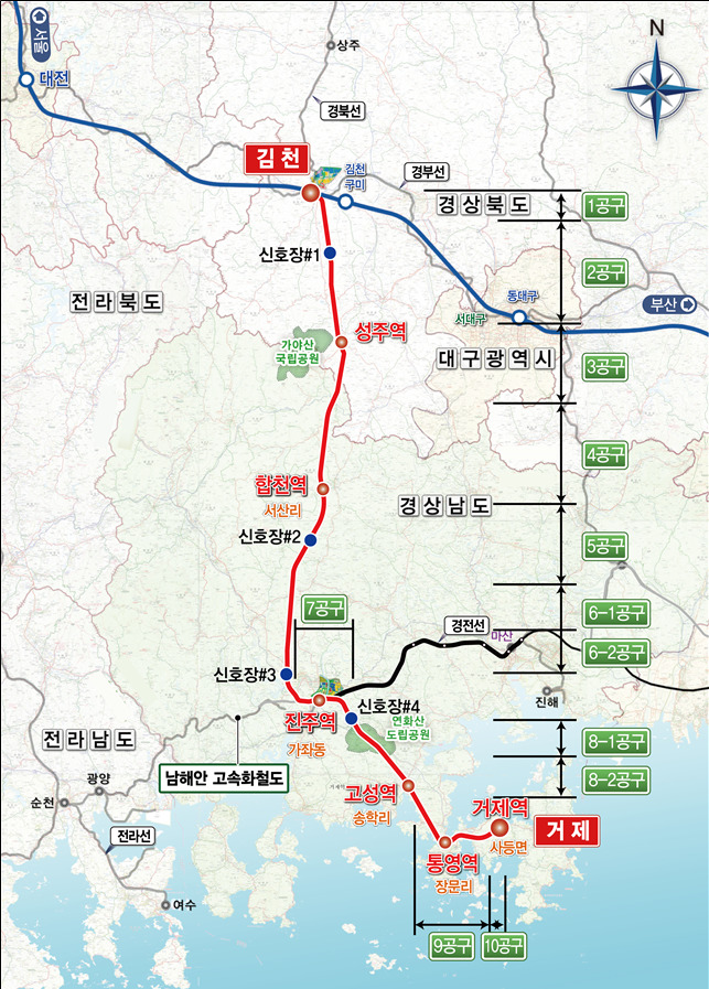 마지막 10공구인 거제 구간은 기본설계를 완료했고.올해 기술형 입찰방식(실시설계+시공)으로 발주될 예정이다. 진주시와 고성군을 포함한 6-2 및 8-1공구는 내년부터 건설사 선정 및 착공이 순차적으로 추진된다.