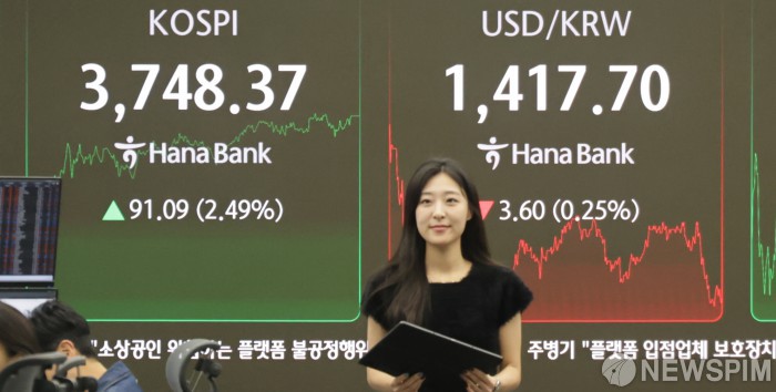 [서울=뉴스핌] 양윤모 기자 = 한미 무역협상의 최종 타결이 가시권에 들어온 가운데, 16일 오후 코스피가 전장 종가보다 91.09 포인트(2.49%) 상승하며 3748.37로, 코스닥은 0.69 포인트(0.08%) 상승한 865.41로 장을 마감한 가운데, 서울 중구 하나은행 딜링룸에서 직원들이 업무를 보고 있다. 서울외환시장에서 달러/원 환율은 전장 대비 3.60원 하락한 1417.70원에 거래를 마감했다. 2025.10.16 yym58@newspim.com