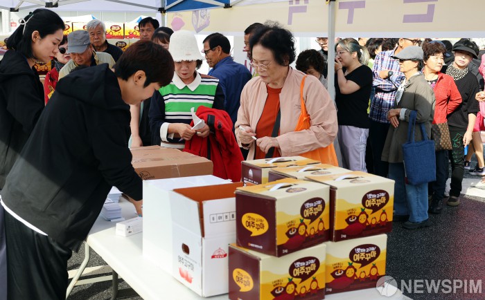 [서울=뉴스핌] 양윤모 기자 = 16일 오후 여주시고구마연구회(회장 이은규) 주최로 세종대왕농협에서 열린 ‘대왕님표 여주꾸마’ 브랜드 출범식에 참석한 시민들이 고구마 나눔행사에 참여하고 있다. 이날 행사에는 이충우 여주시장, 김선교 국회의원, 박두형 여주시의회 의장, 시도의원 등 주요 내빈과 회원 400여명이 참석하였다. 여주시고구마연구회는 이번 출범식을 계기로 지역 대표 농산물인 여주고구마의 브랜드 가치 제고를 통해 전국시장 공략에 나섰다. [사진=여주시고구마연구회] 2025.10.16 yym58@newspim.com