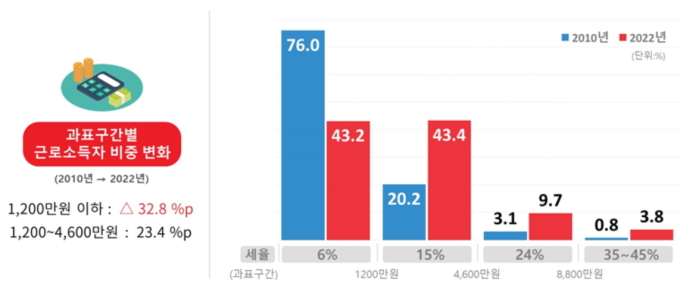 2010년부터 2022년까지 과표구간별 근로자 비중을 살펴보면, 2010년 6%의 저율세율을 적용받던 근로자는 전체의 76%였으나 2022년에는 43.2%로 감소했다. 반면 15% 세율을 적용받는 근로자는 같은 기간 20.2%에서 43.4%로 늘었다.